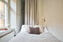 Sovrum också det mot gården. Plats för dubbelsäng om 140 cm, klädkammare bakom draperi med mycket gott om förvaring. Vackert tidstypiskt fönster med vy ut mot innergården.