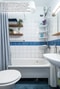 Helkaklat badrum utrustat med WC, handfat med tillhörande spegel samt badkar.