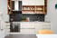 Praktiskt kök med hyllor och underskåp, rostfri bänkskiva och kakel ovanför som stänkskydd. Köket är utrustat med ugn, spis, fläkt samt kyl/frys. Brädgolv, vita väggar och fönster med utsikt mot parken.