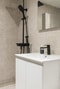 Badrummet är fullt utrustat och renoverat i harmoniska naturtoner. Här finns en rymlig dusch med modern svart takdusch, bra förvaringslösningar samt en egen tvättmaskin som gör vardagen smidig och bekväm. Helheten skapar en fräsch och avkopplande miljö.