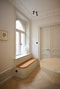 Ett par steg från master bedroom ligger avdelningens stora och smakfulla badrum med golv i portugisisk marmor och väggar i heltäckande ekpanel. Ett högt fönsterparti ger ljus från gårdssidan. Här finns vägghängd wc, kommod i ek med handfat i marmor samt en takdusch i egen alkov helt klädd i marmor. Väggarna döljer inbyggd förvaring och blandarna från Dornbracht är elegant monterade direkt i väggen.