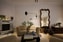 I fil ligger våningens magnifika master bedroom. Bakom en diskret skjutdörr överraskar det stora rummet med väggar i takhög ekpanel och minimalistiskt ren design. Bakom de släta väggarna döljer sig platsbyggda garderober med sparsmakade beslag. Inslagen av ekpanelernas rundade hörn och takets dolda belysning bidrar till den mjuka och organiska atmosfären. I taket finns downlights via nätta armaturer i svart. Den mjuka hotellmattan dämpar ljuden och öppnar ytorna fram till det takhöga glaspartiet ut till balkongen över innergården.
