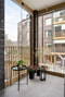 Inglasad balkong med klinkergolv och reglerbara solskydd.