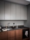 Mörkbetsade skåpluckor i ek och lackade överskåp i mörkgrått