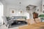 Trevligt vardagsrum med stora fönsterpartier och altandörr ut mot trädgård och uteplats. Parkettgolv och målade väggar.