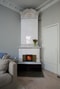 Från hallen kliver man vidare in i bostadens sällskapsrum, ett generöst och stämningsfullt rum där en fungerande kalkugn står som självklar mittpunkt. Golvet består av breda furutiljor i original som samspelar vackert med takrosett, stuckaturer och vita väggar. Rummet är lätt att möblera med både soffgrupp och en rymlig matplats för långa middagar och umgänge. Två stora fönster med djupa speglade nischer fyller rummet med ljus och bjuder på en härligt grönskande och öppen utsikt under sommarhalvåret, där avståndet till nästa hus skapar en luftig känsla och minimerar insynen. I anslutning till kakelugnen finns en praktisk, inbyggd garderob.