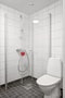 Detta badrum är modernt och fräscht med vitklädda kakelväggar, klinkergolv samt ljusa skåp. Bra förvaring genom ett spegelskåp över handfatet, samt i separat skåp som du finner över tvättmaskinen med inbyggd torktumlare. I badrummet finns en rymlig dusch samt golvvärme.