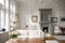 Pardörrar från hallen leder vidare in till bostadens mest storslagna rum som är utsmyckat från golv till tak. En fiskbensparkett med höga fotlister och bröstpaneler ramar in golvet och de vitmålade väggarna. Taket bär extraordinära dekorationer i form av kassetter, listverk och stuckaturer och krönlister omsluter dörrar. En ståtlig eldstad med en mängd tidstypiska utsmyckningar i natursten tronar mitt i rummet. Detaljer värdiga ett slott. Rummets volym är något utöver det vanliga och rymmer flera möblemang. Rummet har även en mindre passage mot rummet intill med två infällda skåp bakom vackra dörrar i vardera sidan. Ett massivt ljusinsläpp kommer från tre höga fönster.