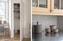 Ljuvligt kök där originalinredningen med profilerade luckor och frostat glas är bevarad och har målats i en havregul ton. Diskbänken är rostfri och de kaklade ytorna ovan bär kvadratiskt vitt kakel från Sekelskifte. Ett nytt, men tidstroget och platsbyggt väggskåp smälter in perfekt bland den ursprungliga inredningen. Bakom en spegeldörr finns ett inbyggt skafferi på plats som har fått nya trähyllor. Maten tillagas på en påkostad gasspis från 2024. Andra tidstrogna detaljer är strömbrytarna av svart bakelit. Samma vackra brädgolv vilar i köket och väggarna är vitmålade. Kökets goda storlek rymmer ett matbord för upp till fyra personer.