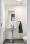 Vidare in i bostaden finns även en gästtoalett med toalett och handfat. Vita väggar och mörkt klinkergolv.