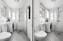 Badrum med helkaklade väggar i vitt utförande och klinkergolv i grå ton. Utrustat med wc, handfat med kommod, spegelskåp samt dusch med glasvägg. Tvättmaskin placerad intill handfatet. Förvaringsskåp finns på vägg. Fönster ger naturligt ljusinsläpp och möjlighet till vädring.