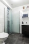 Det renoverade köket har vita luckor och matchande bänkskivor i svart tillsammans med snyggt kakel. Gott om förvaring i skåp och lådor med fullstort skafferi och snygga vitrinskåp med belysning. Påkostade vitvaror där särskilt kan nämnas med side-by-side kyl och frys från SMEG med ismaskin. Vidare är köket utrustat med induktionshäll, varmluftsugn, spisfläkt och integrerad diskmaskin. Laminatgolv och vita målade väggar.
