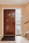 Plastmatta på golv, tapet på väggar samt en garderob för förvaring.