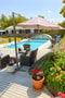 På baksidan väntar en härlig privat oas – en insynsskyddad tomt med trädäck, grönska och ett inbyggt poolområde som gör sommarhalvåret extra njutbart. Här kan du koppla av, umgås och bada i en lugn och rofylld miljö.