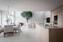 I öppen planlösning ligger det stora köket som får rumslighet av den lägre takhöjden och konstruktionens smäckra pelare. En ovanligt lång köksö delar av med barhäng i ljus marmor med underlimmad ho samt induktionshäll med integrerad nedåtfläkt. Den bitvis takhöga inredningen är formren med släta fronter i trären ek och diskreta beslag i borstat stål. Intrycket är oerhört sobert. Köket är mer än komplett utrustat med helintegrerade vitvaror från mestadels Miele, Siemens och Gaggenau. Köksöns barhäng är bostadens absoluta medelpunkt – från morgonens espresso- och O’boyglas till kvällens samtal och läxläsning medan kvällsmaten görs klar.