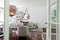 Det kanske mest iögonfallande rummet i huset är allrummet en trappa upp där takhöjden når hela vägen upp till nock med friliggande vita bjälkar som löper längs med och ett stort fönsterparti som täcker hela gaveln utåt trädkronorna. Den högtidliga känslan som råder och ger en känsla av kyrkobyggnad är ett verk av arkitekten som blir stämningsfullt. Rummet har en behaglig heltäckningsmatta att vila fötterna på.