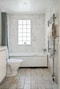 Helkaklat badrum med klinkergolv och golvvärme. Här finns handfat med kommod, badkar, badrumsfönster spegelskåp och handdukstork.