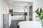 Ljust kök med matrum. Utsikt mot uteplats. Klinkergolv och målade väggar. Vita köksluckor, kyl, inbyggnadsugn, inbyggd mikrougn, diskmaskin, induktionshäll och bänkskiva av stenmaterial. I matrummet finns även en förvaring i garderob.
