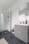 Till detta utsökta boende välkomnas Ni till en hall med ljus omgivande ytskikt samt praktisk klinkerbelagt golv. I anslutning finns estetiskt tilltalande badrum med naturligt ljusinsläpp via fönster. Klinkerbelagt golv samt kaklade väggar. Utrustningen utgörs av dusch, vikbara duschväggar i transparent glas, WC, handfat med kommod samt spegel med inbyggd belysning.