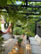Den välskötta tomten är delvis naturtomt och bjuder på en vacker och trivsam utemiljö. Här samsas gräsytor med uppvuxen grönska såsom plommon- och fikonträd, syrener, rododendron och vinrankor, vilket skapar en lummig och insynsskyddad oas. Den charmiga pergolan blir en naturlig samlingsplats under sommarhalvåret – perfekt för långa middagar, avkoppling och umgänge.