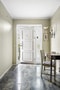 Redan i entrén möts du av en luftig och välkomnande hall med ett vackert stenlagt golv som löper genom rummet. Den vita ytterdörren med dekorativa speglar och sidoljus släpper in ett mjukt dagsljus som ger rummet en harmonisk ton. Här finns fin plats för möblering, vilket skapar en inbjudande första kontakt med hemmet.