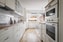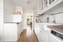 Ifrån hallen kommer man vidare in till köket. Detta renoverades 2021 och är inrett med vita luckor och skåp. En laminatskiva med imitation av trä ligger som en bänkskiva och luckorna dekoreras med guldbeslag. Vitt kakel skyddar väggen bakom. Här finns kombinerad kyl och frys (Samsung), diskmaskin (Bosch), induktionshäll och inbyggd mikro och ugn. Ni har en dubbel diskho som går i vitt.