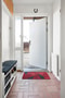 Välkommen in i en ljus och välkomnande hall med terrakottafärgat Höganäsklinker och vitmålade väggar. Här finns gott om plats för både ytterkläder och skor. Intill hallen ligger en praktisk gäst-WC med dekorativt röda väggar, utrustad med WC och handfat.